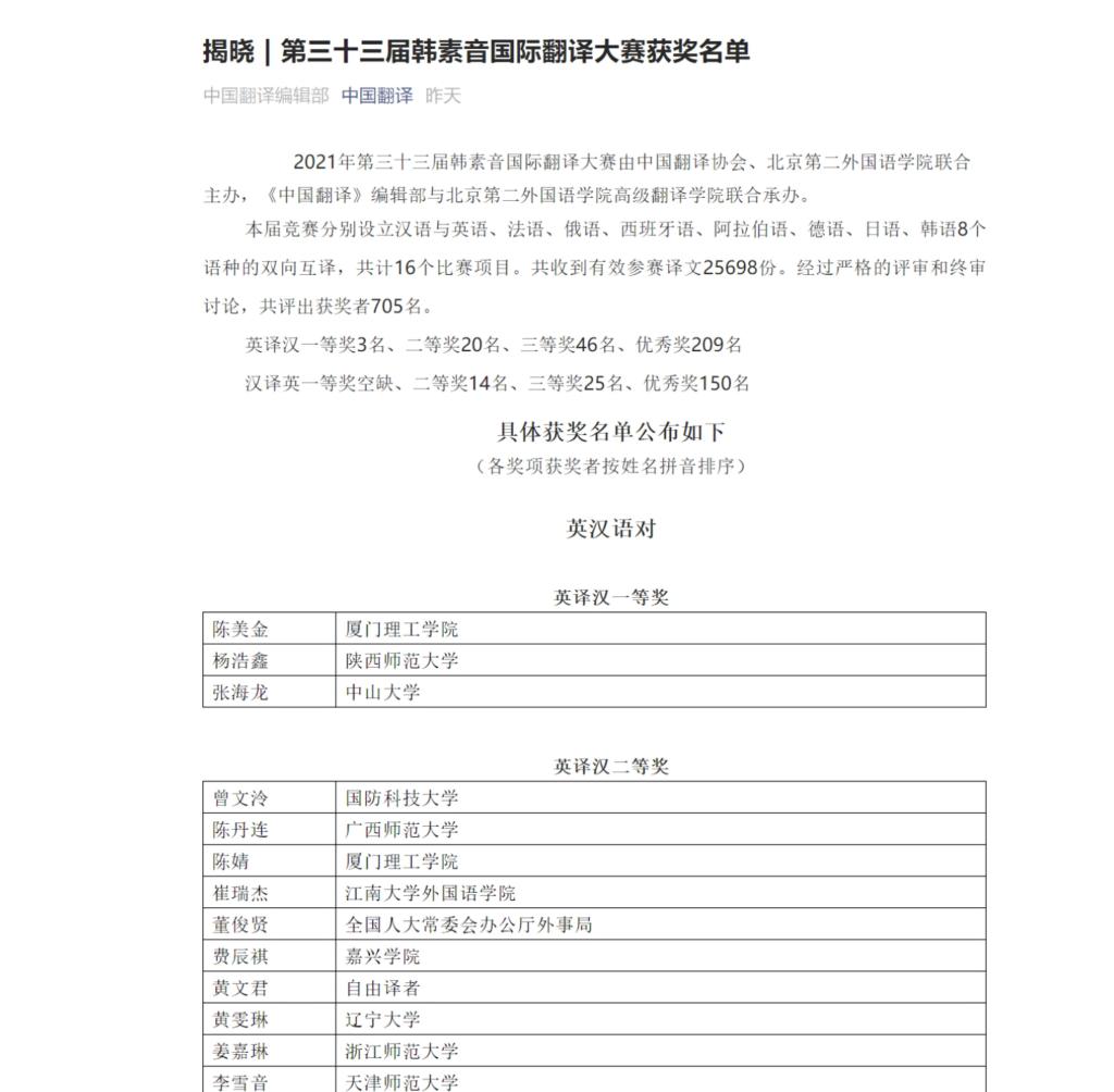 据悉,韩素音国际翻译大赛至今已成功举办三十三届,受到全国乃至海外青年翻译爱好者的欢迎和认可,在语言应用能力、知识涉猎广度与深度、翻译技巧掌握与运用程度等方面对选手提出了较高的要求。因此,威尼斯官网学生在本次比赛中取得优异成绩是对威尼斯官网外语人才培养质量的展示,希望更多的外语学子能积极拓展专业知识,成长为卓越的外语人才。