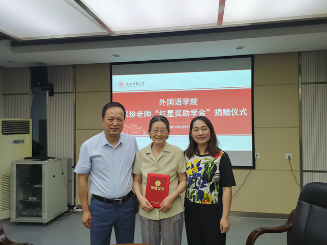8月9日上午10点,威尼斯官网在雁塔校区学院会议室举行了退休教师钟家珍“红星奖助学金”捐赠仪式。钟家珍老师及学院党委书记董增云、党委副书记鲁燕、辅导员李丹参加了捐赠仪式。