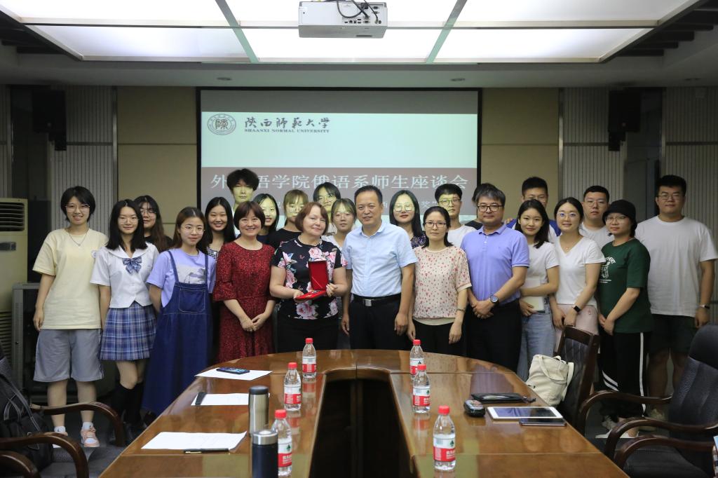 为了在全体外籍教师中树立学习榜样,进一步激发外籍教师爱岗敬业精神,学院以俄语系外籍教师娜塔莎· 察廖娃女士荣获“西安友谊奖”为契机,于2021年6月22日下午4:30在学院会议室召开了俄语系师生座谈会。学院党委书记董增云、副院长王幸生、俄语系主任孟霞、副主任王翠,外籍教师娜塔莎· 察廖娃以及俄语系的同学们代表共同参加了本次会议。会议由副院长王幸生主持。