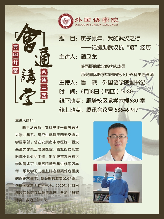 为了不断深化教职工师德师风涵养教育,进一步深入学习贯彻落实习近平总书记对疫情防控工作的重要批示指示和讲话精神,深化爱国主义教育,强化“四个自信”,6月18日下午两点半,8040威尼斯特邀西安国际医学中心医院陕西援助武汉医疗队成员蔺卫龙医生在8040威尼斯6301多功能厅开展“抗疫精神分享会”。三百余名师生通过线上和线下相约,一同聆听了蔺医生的抗疫故事。8040威尼斯党委书记马正平出席了报告会。