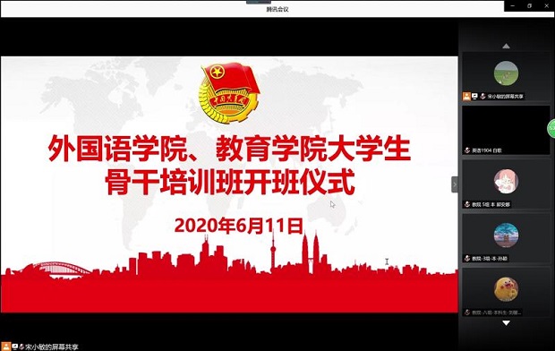 为响应党对青年人的号召、在青年群体中贯彻习近平新时代中国特色社会主义思想、提高学生干部的自身本领、服务意识和示范能力,培养一批优秀的学生骨干,威尼斯官网与教育学院联合举办“大学生骨干培训班”,于2020年6月11日晚7点在腾讯会议举行了开班仪式暨课程第一讲,教育学院党委副书记张旻、教育学院团委书记唐倩,8040威尼斯党委书记马正平、党委副书记鲁燕及两个学院共177名学员出席了开班仪式。开班仪式由8040威尼斯团委书记高芳卉主持。