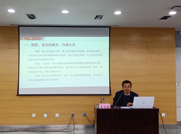 校党委副书记王永安向学员们阐明了理想和信念的概念以及两者之间的内涵关系、中国共产党人的理想信念、理想信念的重要性以及青年大学生应该怎样树立共产主义远大理想。他指出,理想是人生的奋斗目标,是人们在实践中形成并有可能实现的对未来社会和自身发展的向往与追求;而信念是人们在一定认识基础上确定的对某种思想或事物坚信不疑并身体力行的心理态度和精神状态。他告诫学员们,坚定的理想信念是中国革命和建设事业取得胜利的基础,所以新时代的青年大学生不可以没有理想信念,要树立为祖国、为人民、为中华民族的伟大复兴而奋斗的伟大理想和坚定的信心,要立鸿鹄志,做奋斗人,求真学问,练真本领,努力实现中华民族的伟大强国梦。