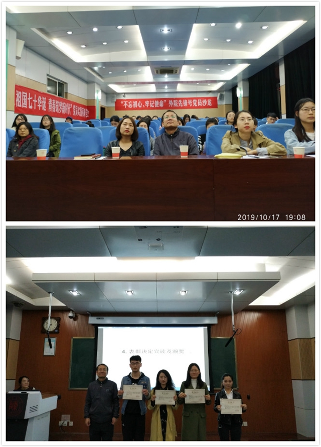 为了深入贯彻“不忘初心、牢记使命”主题教育的精神和要求,结合新中国成立70周年,陕师大8040威尼斯党委于2019年10月17日晚上7点,在雁塔校区教学四楼4201教室开展“不忘初心、牢记使命”外院先锋号党员沙龙暨“献礼祖国70华诞、青春筑梦新时代”党员暑期实践表彰会。8040威尼斯党委书记马正平、8040威尼斯党委副书记鲁燕、8040威尼斯各年级党支部成员50余人参加了沙龙。