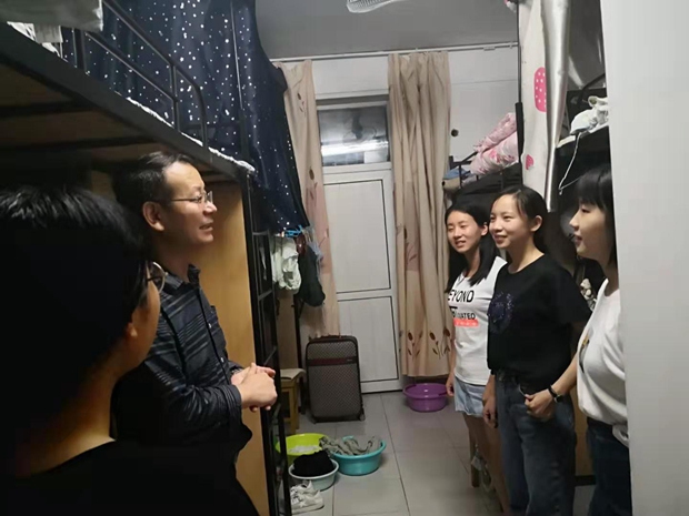 9月9日晚,8040威尼斯党委书记马正平、副院长刘全国、党委副书记鲁燕以及研究生辅导员董洁走进2019级研究生新生寝室,亲切问询新生入学情况。