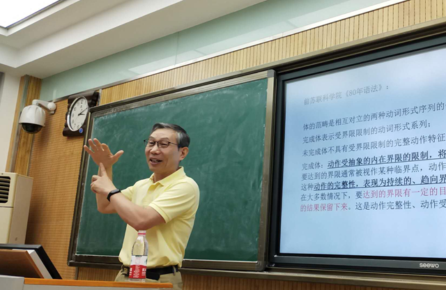 金立鑫教授的报告首先强调语言研究中事实与逻辑具有重要的作用,然后根据语言类型学的研究范式,主要以汉语、英语与俄语语言样本为例,分析了汉、英动词的时体范畴概念与形态表现,对比了这三种语言中体的相似性与差异性,尤其以较为充足的例子详细分析了俄语动词完整体与非完整体的形式表达与语义差异。最终得出俄语是事件边界或内部既定界限敏感的语言,表现为“界限体”类型,而汉语是对事件的起始、持续和结束各阶段转变敏感的语言,表现为“阶段体”类型。报告中,金教授也通过一些别的语言类型,如索马里语、芬兰语、韩语等解释了语言现象的多样性以及不同语言在表达事件状态时语言手段的差异性。最后金教授则对俄语中的绝对时间和相对时间作了概括和解释。在问答互动环节金教授以深入浅出的语言回答了师生提出的若干问题,对以往包括Reichenbach等国内外学者的时体研究作了精彩的评析。金教授的理论知识深厚、研究严谨且富有逻辑,语料丰富而有趣,这些都使听众受益匪浅。