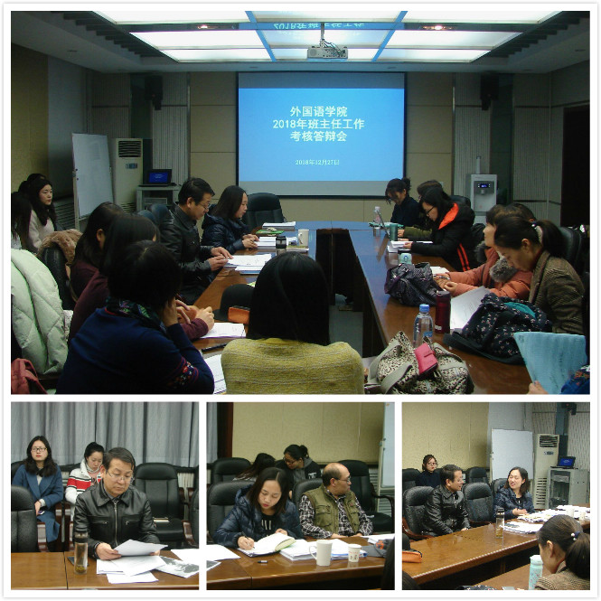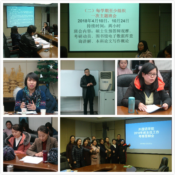 随后,工作满一年的10位班主任依次进行述职答辩。曹春阳老师汇报了他对所带学生教授Matchware交互课件程序制作的工作内容。马珊老师汇报了参加班级主题班会,对学生进行就业考研指导、开展美国文化讲座情况。王勤老师汇报了她在听课班会等方面开展的工作,尤其是以“如何成长为优秀教师”为主题开展师范班工作。张春娟老师汇报了与辅导员及特殊学生的座谈及谈话情况,尤其是课堂学习及专四备考指导的情况。李伟芳老师汇报了帮助俄语学生备考英语六级及考研指导情况,分享了考研信息检索、“网络信息时代背景下外语专业学习者的批判性思维”讲座、以写促学的写长法讲座情况。王西强老师汇报了对班级跟班听课及座谈面谈情况,以及请专家为同学们介绍翻译经验和译者心理,鼓励学生根据自己的学术兴趣投身科研工作的情况。陈蕾老师汇报了开展主题班会的具体内容及邀请国外教授指导学生参与暑期学校的情况,同时汇报了专四指导、邀请铁一中老师做报告、创新创业辅导的情况。杨盛兰老师汇报了参与学生班会以及听课中发现的问题,开展每月定期见面的谈心谈话情况和汉语文化翻译相关讲座。乐燕子老师汇报了参与学生班会,成长经历分享及实践情况,同时汇报了对学生专业学习上的指导。戴琨老师围绕班主任工作“六个一”的要求汇报了在专业学习上学生存在的问题,并分享了组织学生旁听硕士答辩观摩指导,介绍了图书馆电子数据库查询,开展本科生写作规范和科研项目申请方法指导等情况。
