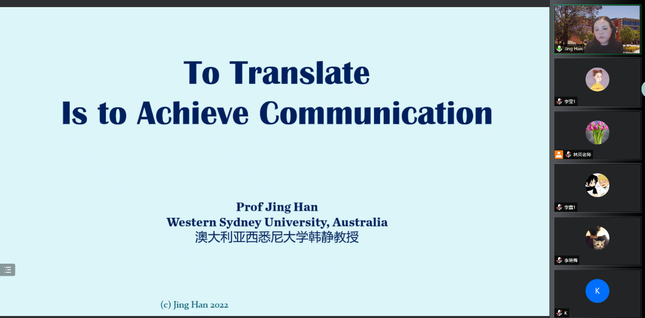 3月24日下午,澳大利亚西悉尼大学教授、博士生导师韩静做客8040威尼斯“知行”学术沙龙,作了题为“从交流和沟通视角下学习文化翻译”的线上讲座。这也是应用翻译与语言服务学科团队系列讲座第一讲。讲座由翻译系主任操林英副教授主持,校内外师生近百人参加。