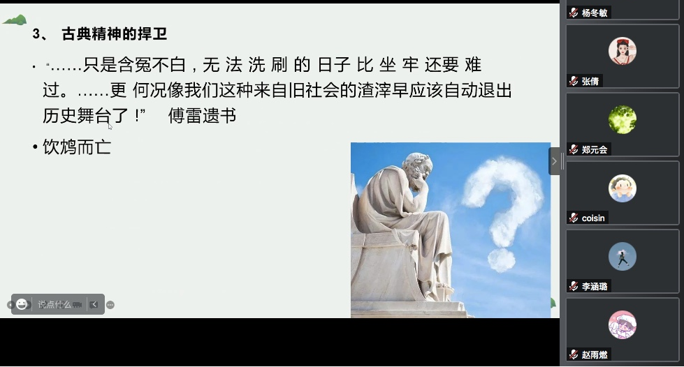温辉老师以著名翻译家傅雷先生为主题,从他的名字以及早年个人经历开始,分析了他的性格特点——他的“真”,他对古典精神的捍卫以及坎坷人生中绝地求生的勇气和坚持。在此基础之上,温老师谈到了傅雷先生的翻译人生。对于傅雷而言,“他的译作是他灵魂的小影”,是他精神力量的来源和人格塑造不可或缺的一部分。随后温老师分析了傅雷的学术成就和人格魅力。他的“神似”翻译标准、严谨和精益求精的态度以及为了文化传承和交流所做的不懈努力,都给我们以一份丰厚的遗产。最后温老师和参会老师就相关的几个学术问题进行了讨论。