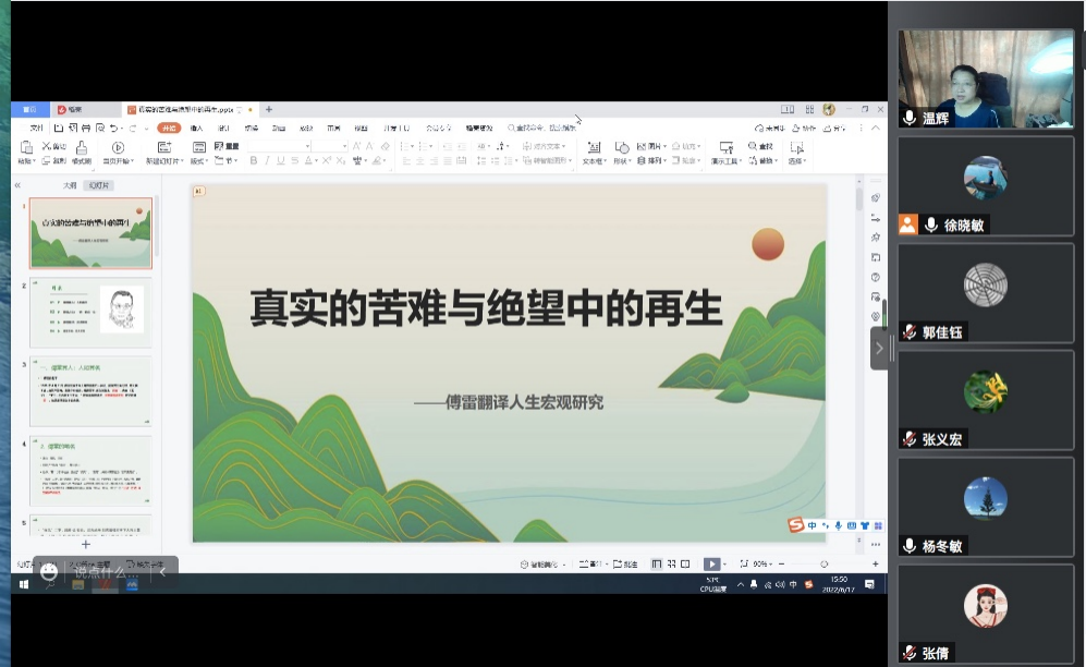 为了扩大威尼斯官网师生的学术视野和学术兴趣,8040威尼斯于6月17日下午2:30以腾讯会议方式在线举办了“翻译教学与文化”系列活动第一次沙龙“真实的苦难与绝望中的再生:傅雷翻译人生宏观研究”。本次讲座由威尼斯官网翻译系资深教师温辉老师主讲,8040威尼斯部分教师、研究生和本科生参加并参与讨论。