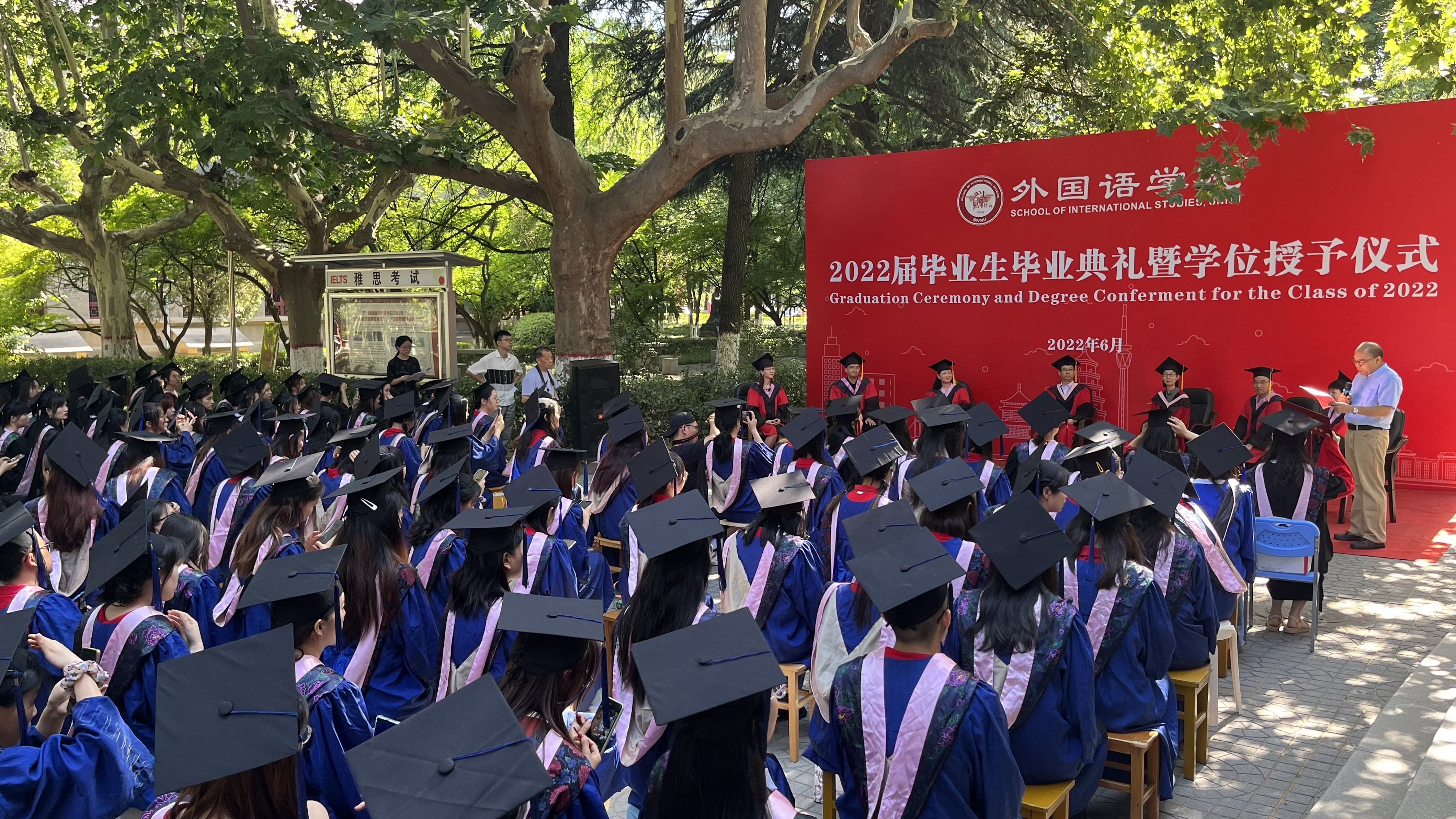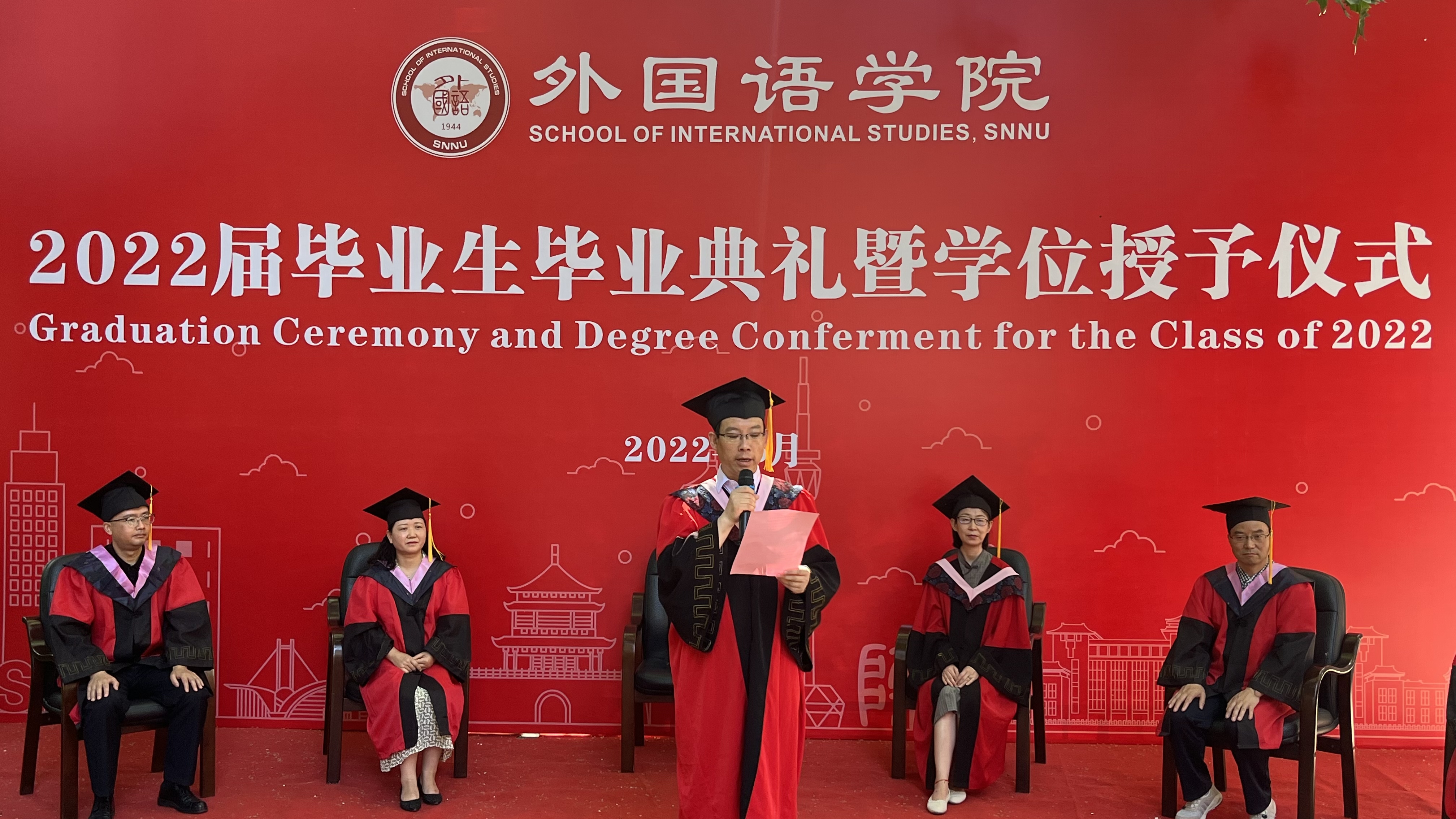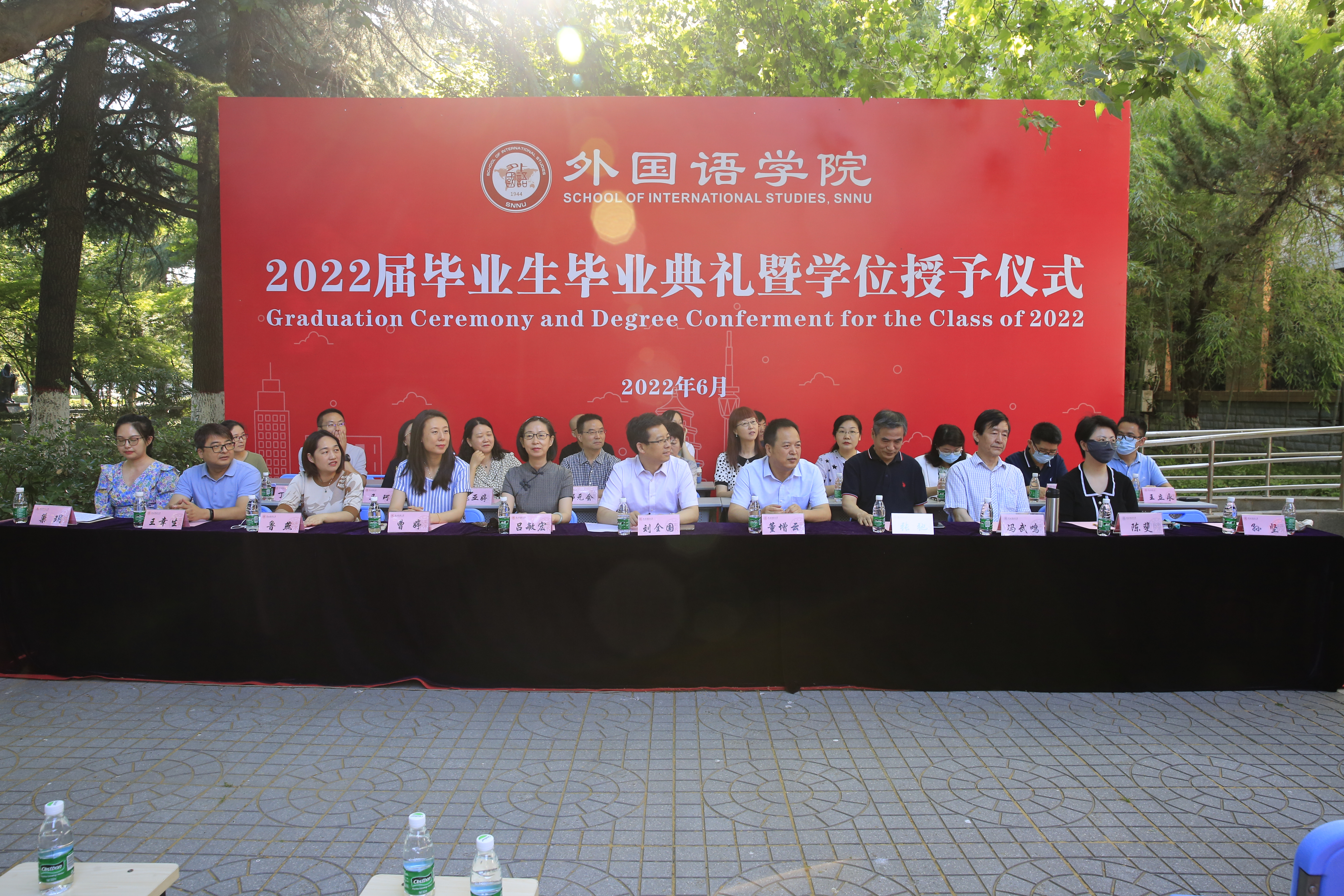 6月24日上午,威尼斯官网2022届学生毕业典礼暨学位授予仪式在教学六楼门前广场隆重举行,典礼同时在腾讯会议平台直播。8040威尼斯院长刘全国教授、党委书记董增云、学院前党委书记张弛、冯武鸣、副院长吕敏宏、曹婷、王幸生、党委副书记鲁燕、公共外语教学部主任马珂、英语系主任朱冬怡、副主任王立永、丁礼明、翻译系主任操林英、副主任杨冬敏、俄语系主任孟霞、副主任王翠、法语系副主任乔溪、日语系副主任许赛锋、学位委员会成员郑元会、张亚婷、魏军梅、办公室主任陈斐、语言语音教学中心主任邢俊升、团委书记李丹,以及全体辅导员出席典礼。典礼由8040威尼斯副院长孙坚教授主持。威尼斯官网2022届毕业生在学院领导和老师的共同见证下,拨穗正冠,开启人生新的旅程。