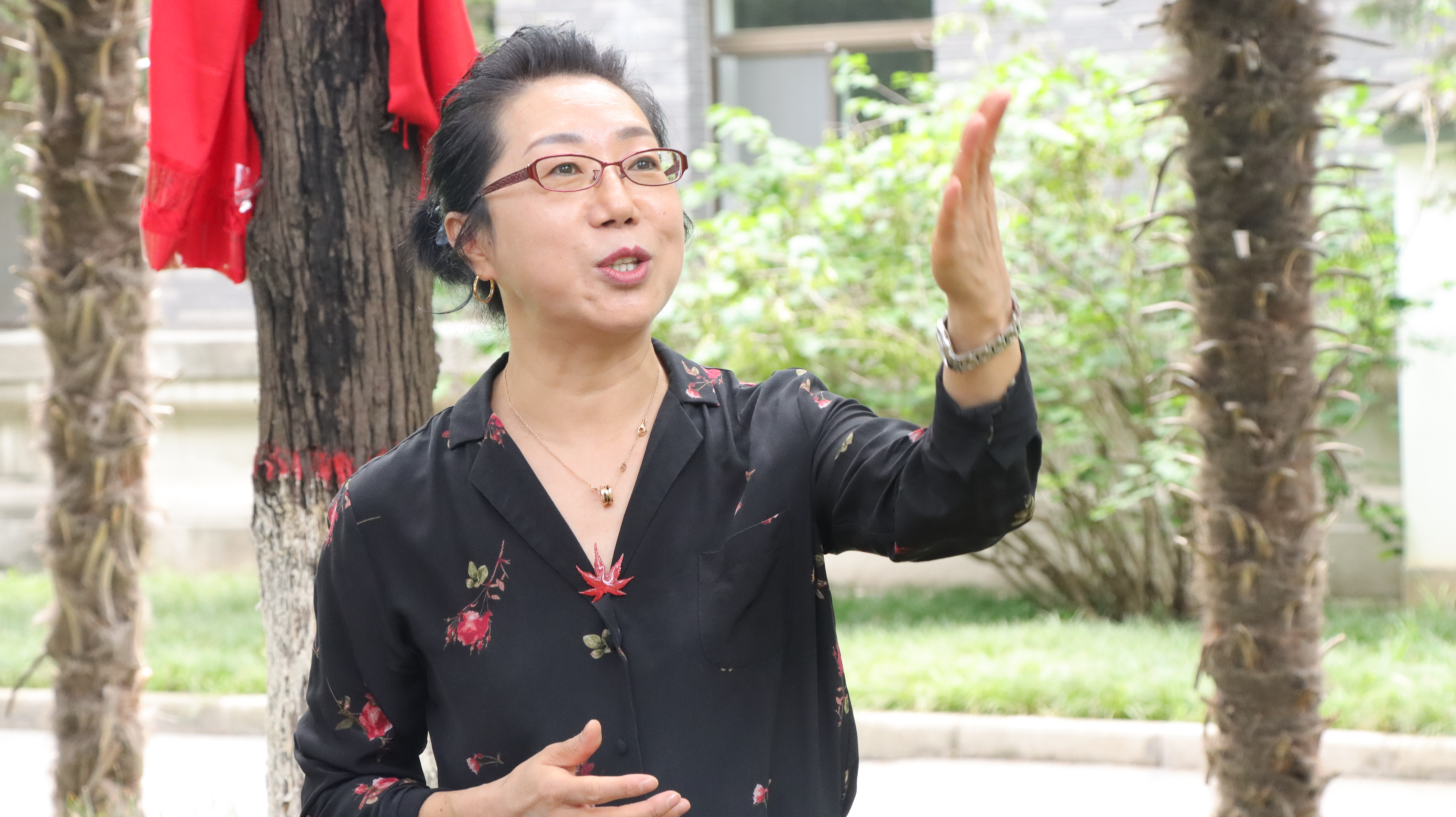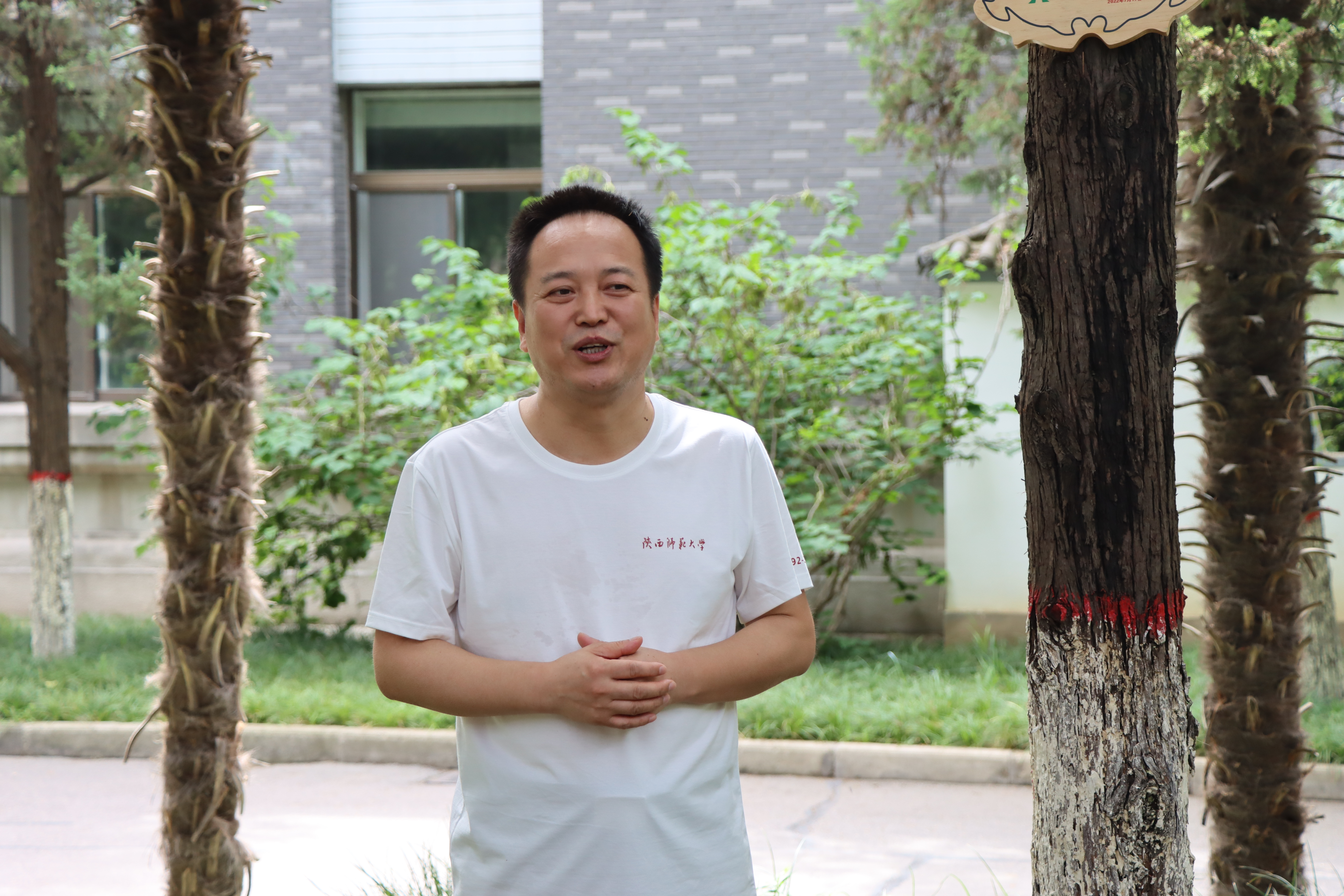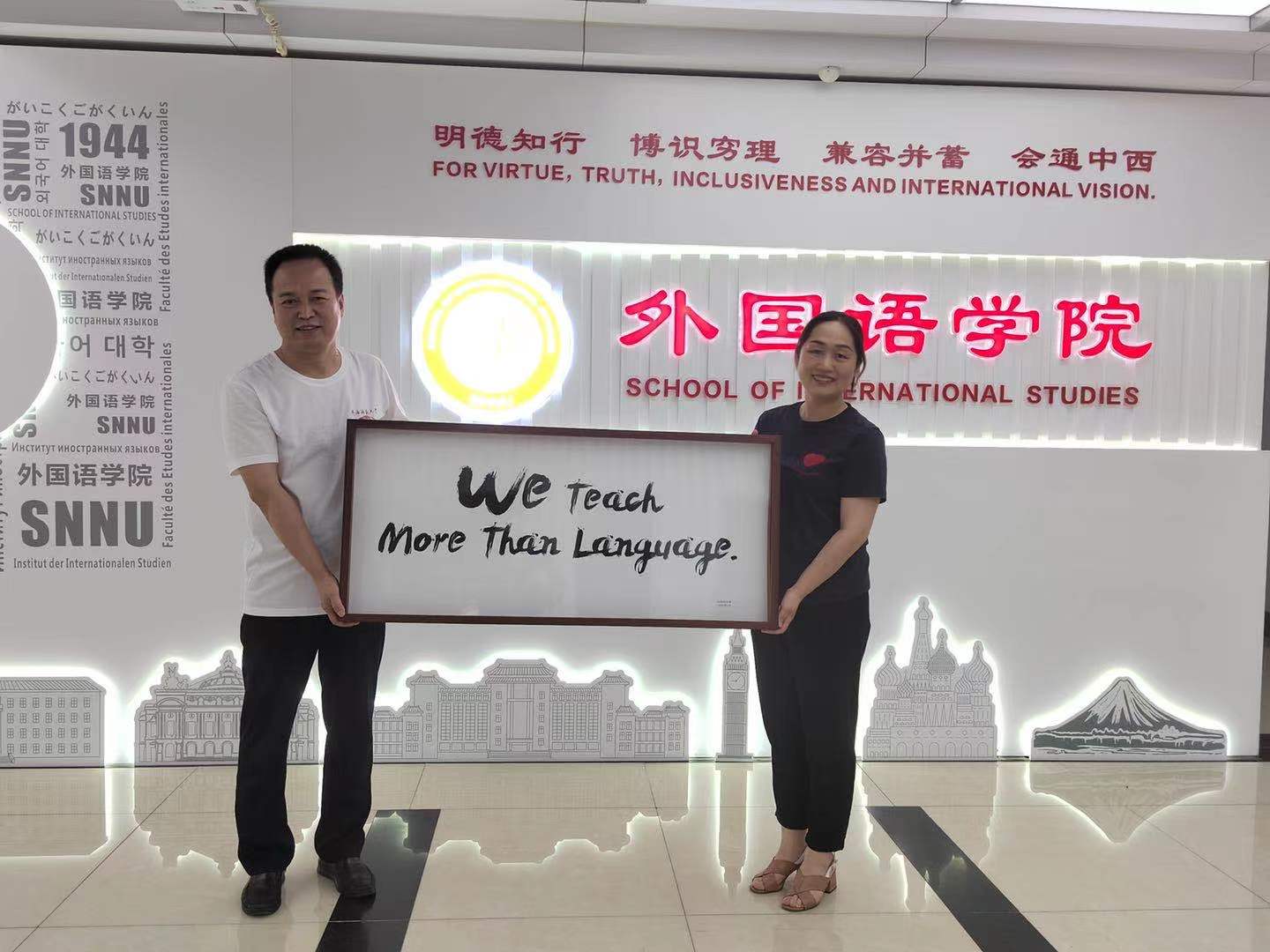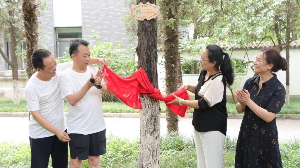 当日下午,外语系6名1992届校友代表返回母院,在学校党委副书记卢胜利、学院党委书记董增云、原1992届辅导员韩彬梨、党委副书记鲁燕的见证下,校友们在校友林举行了简短而热烈的校友林油松认领揭牌仪式。董增云在发言中对院友们的到来表示欢迎,同时希望大家常回家看看,在今后的发展中越来越好。随后,6位校友代表全体外语系1992 届校友为学院送上了一幅写有“We Teach More Than Language(我们不只教授语言)”字样的牌匾,表达外语学院在教授学生语言的同时,也教授学生语言之外/之上更加广袤深刻内容的寓意。随后,董增云代表学院向1992届校友送上了纪念印章,并表示,学院将以邮寄的方式将学校和学院为全体1992届校友准备的纪念品寄送给大家。