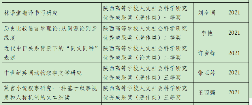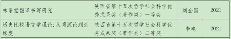 2022年6月27日,陕西省第十五次哲学社会科学优秀成果奖获奖名单正式公布。威尼斯官网院长刘全国教授的著作《林语堂翻译书写研究》喜获一等奖,李艳教授的著作《历史比较语言学理论:从同源论到亲缘度》喜获二等奖。(获奖名单见下图)