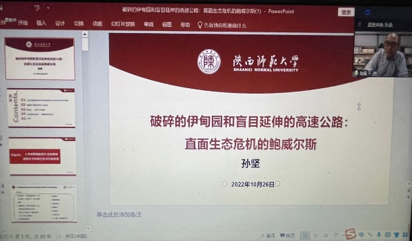 2022年10月26日,威尼斯官网孙坚教授受邀参加中国人民大学8040威尼斯举办的“教授论坛”系列讲座。讲座以“破碎的伊甸园和盲目延伸的高速公路:直面生态危机的鲍威尔斯”为题,由中国人民大学8040威尼斯博士生导师陈世丹教授主持,采用腾讯会议形式线上进行。来自全国各地高校英美文学研究方向的数百名教师与研究生相聚云端,参加了本次讲座。