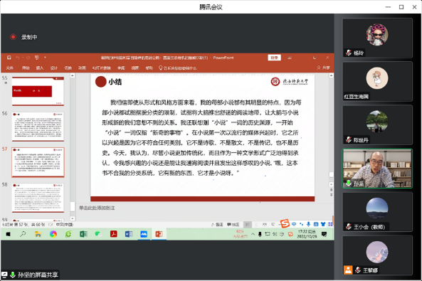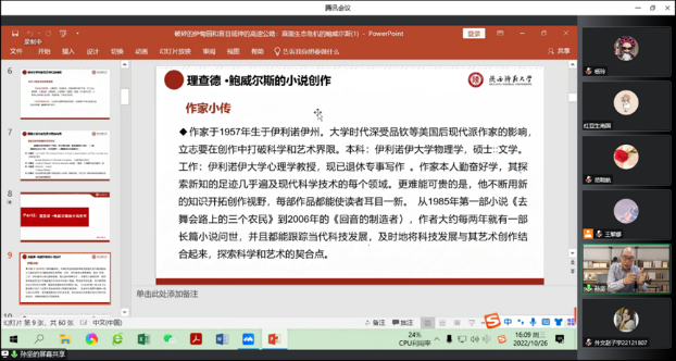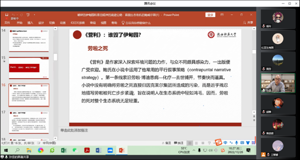讲座中,孙坚教授围绕着美国当代著名小说家理查德•鲍威尔斯的生态小说创作,旁征博引,带领听众进入作家构建的文学世界。孙坚教授还根据自己在美访学期间和作家本人的互动交流,谈了作家的心路历程。讲座以人类所面临的生态危机和美国文学中的生态书写传统做铺垫,引出理查德•鲍威尔斯的小说创作,以《营利》和《回音的制造者》为例,进一步分析了鲍威尔斯小说中所表现的生态书写和作家对科技对人类生活环境影响的焦虑。 讲座将鲍威尔斯与前辈作家对比,论述了鲍威尔斯的独特风格。在讲座中,孙坚教授领着老师和同学们深入思考了人与自然的关系、体会到了人在生态系统中的渺小,并引发老师同学们对于科技进步对人类社会发展与自然文明影响的思考。