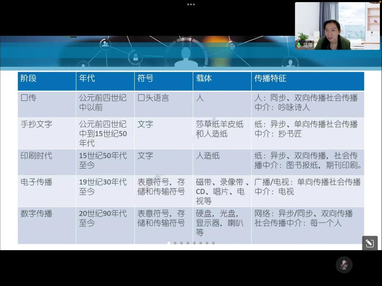 首先马萍老师向大家介绍了教育中技术的发展历史,在马老师的带领下,学生们一起了解了教育中技术的发展阶段以及每个阶段教育技术的传播特征,马老师特别强调,教育中的技术在不断向智能化发展。