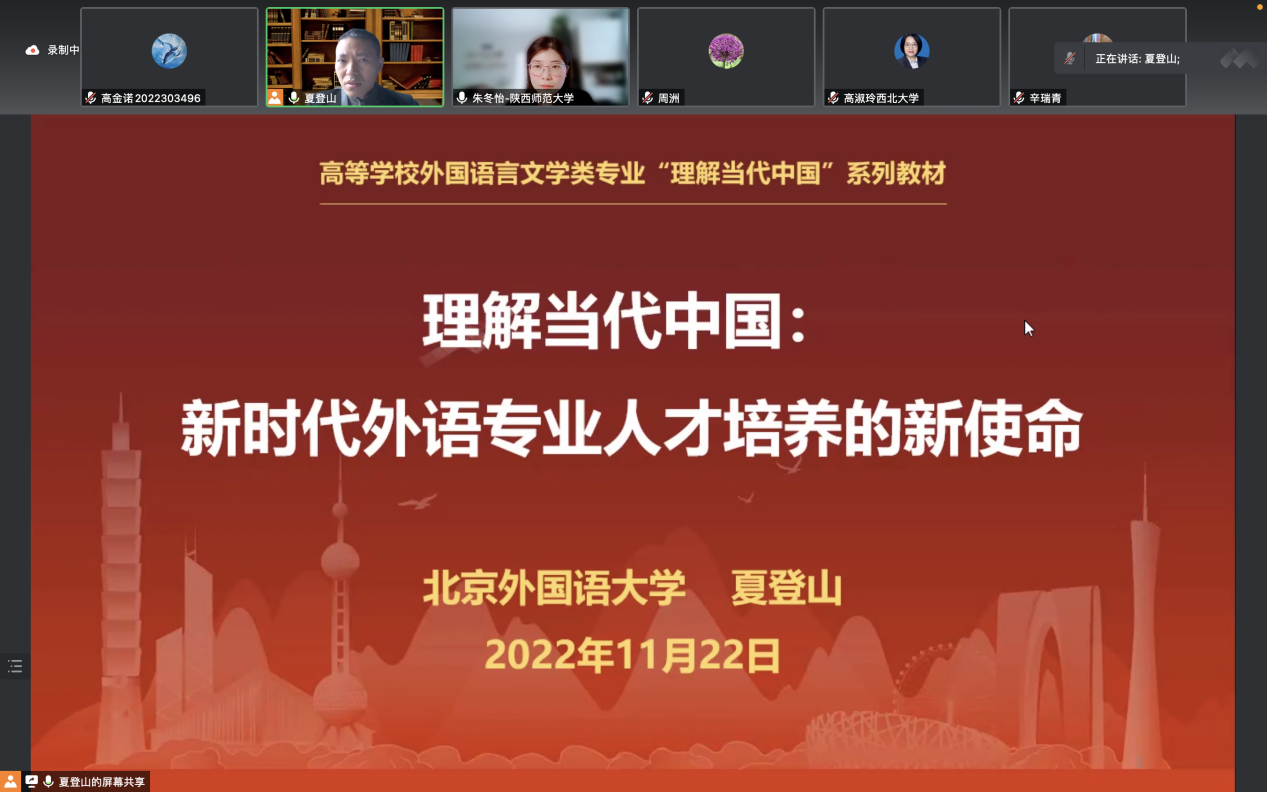 2022年11月22日下午,威尼斯官网于线上成功举办了以“理解当代中国:新时代外语专业人才培养的新使命”为主题的一流本科专业建设论坛,本次论坛由北京外国语大学夏登山教授主讲,威尼斯官网朱冬怡副教授主持,100余名校内外师生参与了交流讨论。