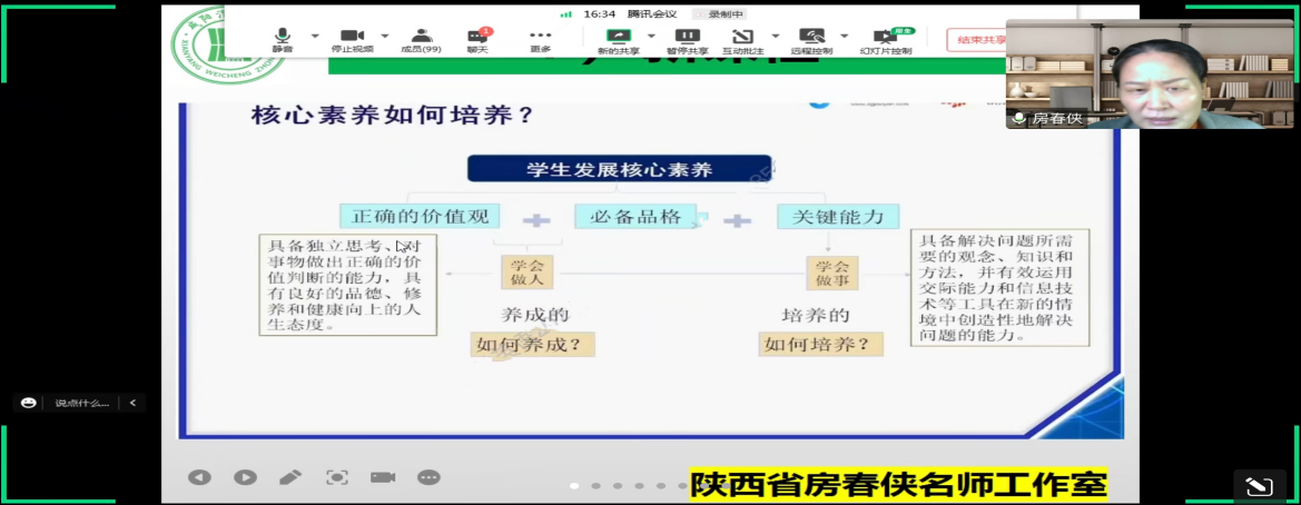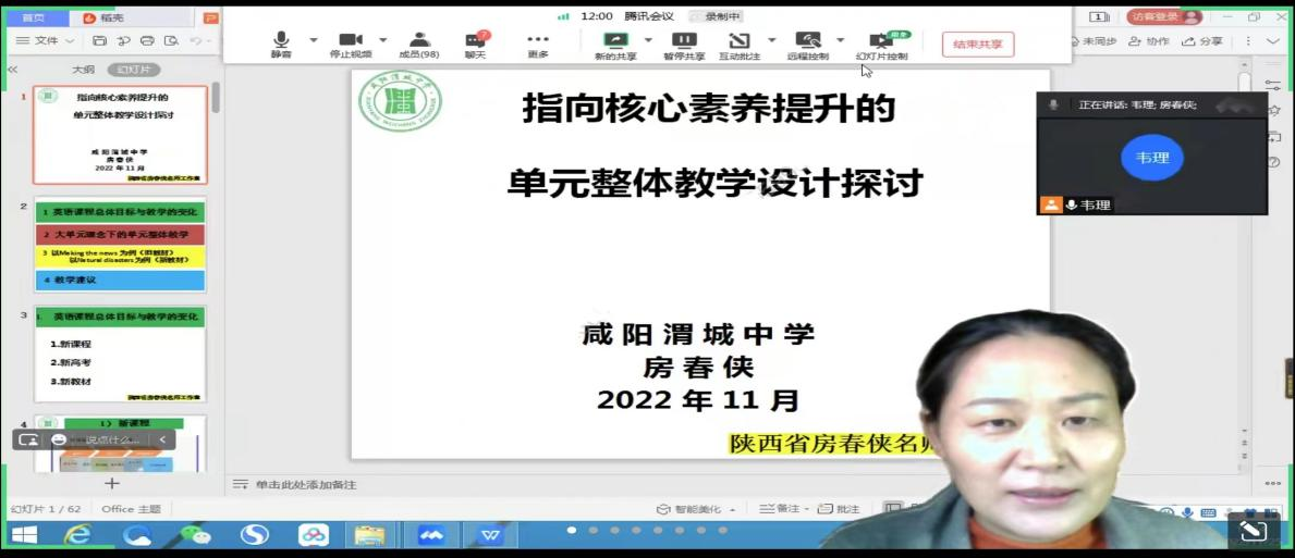 随着新课程新教材实施进程的推进,课程建设起着举足轻重的作用。基于核心素养的新课程要求树立新的学生观,以学生为本,培养学生终身发展的所需技能。英语学科核心素养靠单一、零散、局部的课程是无法实现的,新课程的实施需要依托单元教学实现,必须用整体的、连贯的、结构化的课程支撑,基于整体单元教学,落实立德树人的根本任务。为了提高威尼斯官网学科教学(英语)专业教育硕士的外语教学能力,学院于11月25日下午在腾讯会议线上开展了基础教育外语教学专题研究系列讲座第十一讲——指向核心素养提升的单元整体教学设计探讨。本次讲座由咸阳渭城中学高级教师、陕师大2013届教育硕士、陕西省省级名师、省级带头人、陕西省教学能手、全国英语优质课一等奖房春侠老师主讲,韦理老师主持。8040威尼斯2022级学科教学(英语)专业教育硕士参与聆听。
