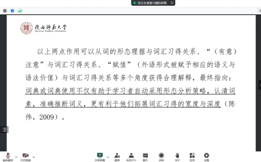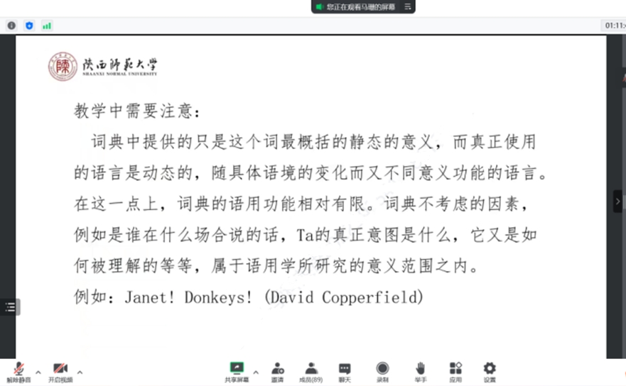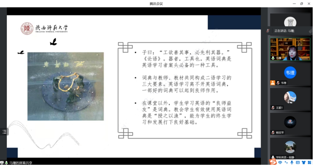 首先马老师通过引入日常生活中词典的使用,强调了词典的重要性。她指出作为教师,我们应该教会学生意识到词典工具的重要性以及教会学生使用词典这一重要的工具。接着马老师对于词典与外语教学的对接面进行了学理归因。