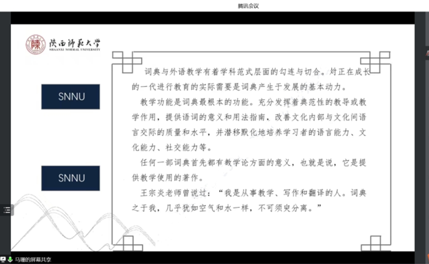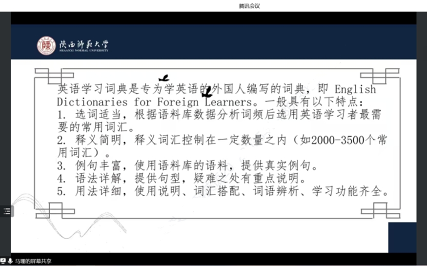 为了提高威尼斯官网学科教学(英语)专业研究生的外语教学能力,加强学生对外语教育学科价值的理解,8040威尼斯于12月2日下午在腾讯会议线上开展了外语教育学科前沿讲座第十三讲——英语学习型词典与外语教学。本次讲座由8040威尼斯马珊老师主讲,会议由韦理老师主持。8040威尼斯2022级学科教学(英语)专业教育硕士聆听了讲座。