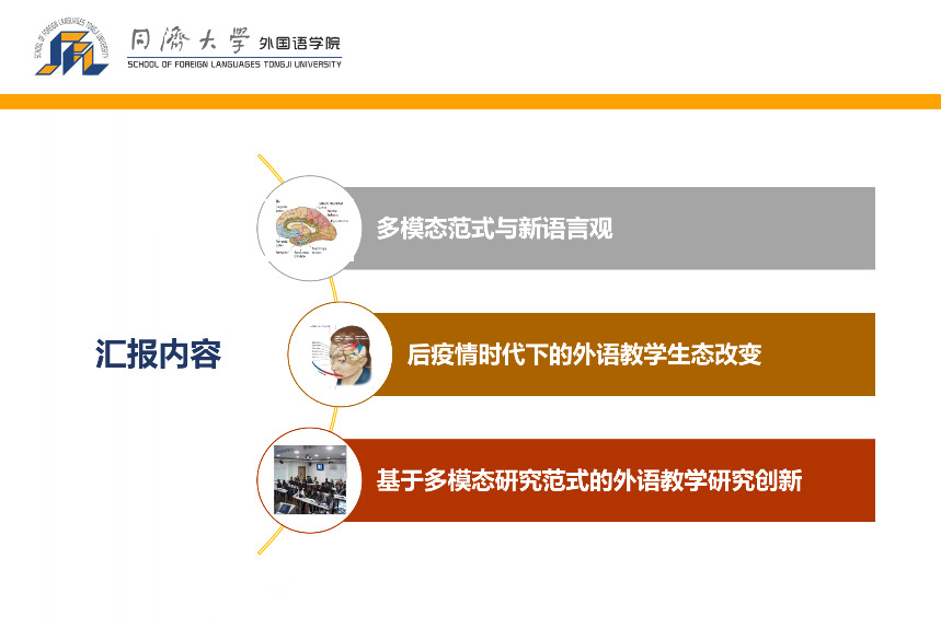在新冠肺炎疫情已深刻影响到教育领域的的背景下,多种教学形态并行的混合形态提出了教学活动要为师生提供跨时空、跨地域、沉浸式融合互动体验的新要求,这不仅为教学形态拓展了良好的发展窗口,还提供了衍生重构的机遇。基于此,黄老师就多模态与新语言观、后疫情时代下的外语教学生态改变、基于多模态研究范式的外语教学研究创新三个方面开展具体讲解。