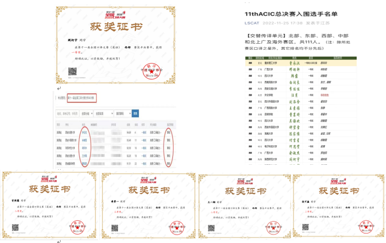 第十一届全国口译大赛总决赛于近期落下了帷幕,威尼斯官网在此次大赛中获得了喜人成绩。全国口译大赛以中国外文局为指导单位,中国翻译协会主办,是国内专业权威度极高的口译比赛。此次大赛自2022年3月启动,受疫情影响,初赛,陕西省复赛,大区赛,全国总决赛分别于5月28-29日,6月25-26日,9月24-25日,12月17-18日在线上举行。