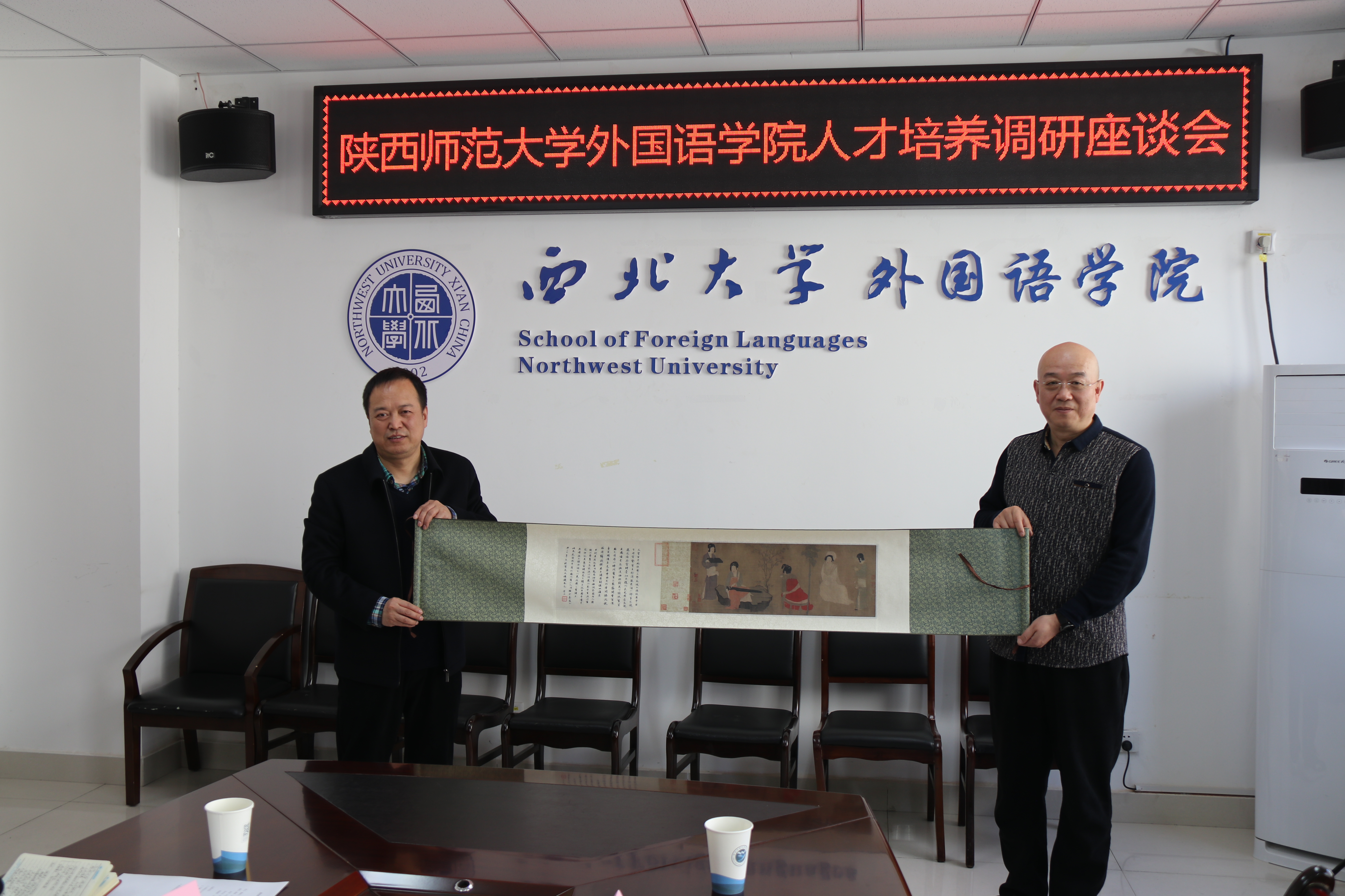 交流会上,孙坚副院长对校友曹若男在工作上取得的进步表示关心和祝贺。威尼斯官网董增云书记和西大8040威尼斯院长曹若男分别就两个学院的学科设置,科研成果和师生规模等基本情况做了交流,表示希望通过此次交流会能够互相学习在人才培养,公共外语教学改革,社会服务和学生管理等方面的先进经验。西大外院副院长苏蕊详细介绍了学院的发展历史,并追溯了两院之间的历史渊源。西大外院副院长李蓂介绍了学院开设公共外语课程教学的具体做法。辅导员赵明星就学生工作情况作以交流。会后,两院互赠纪念品并合影留念。