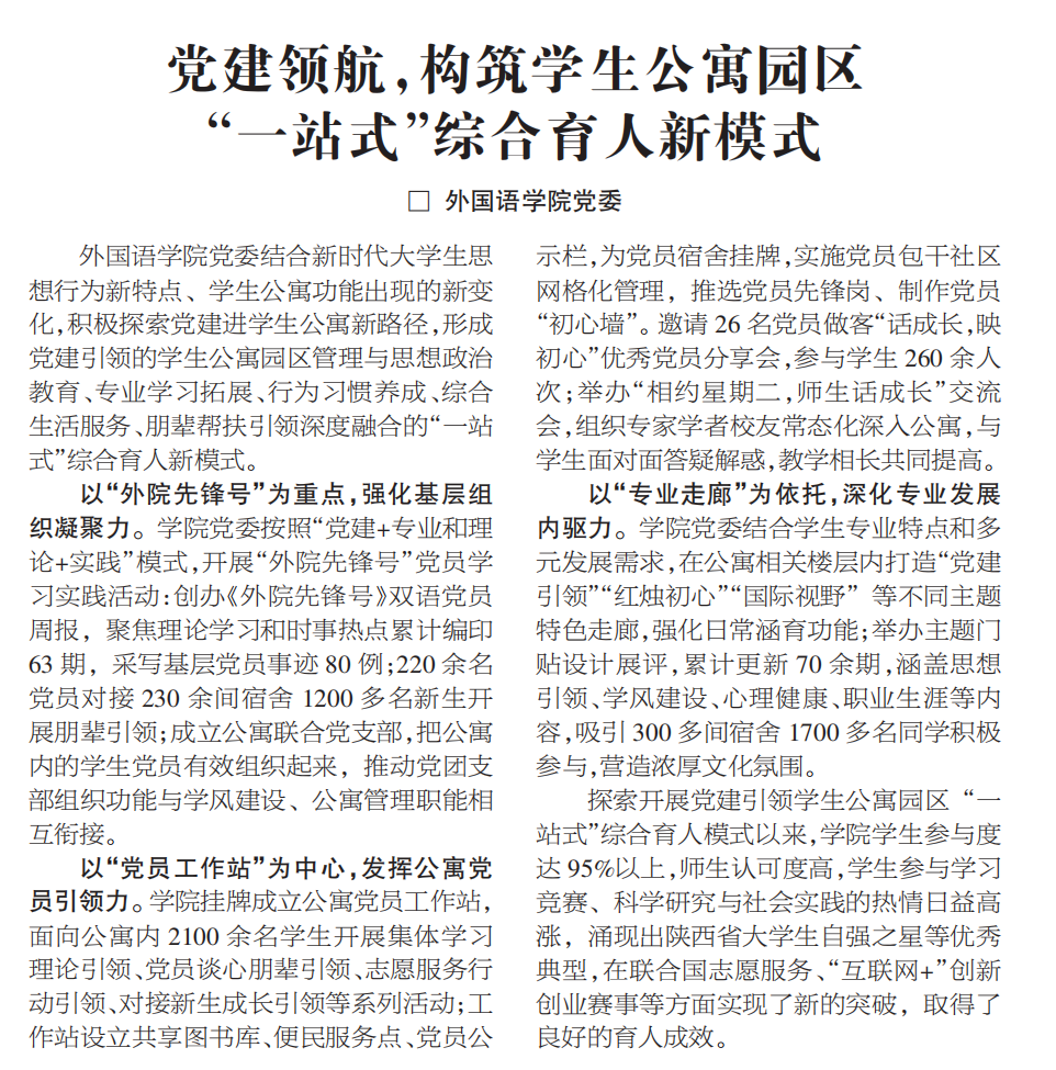 《陕西师大报》677期第三版以《党建领航,构筑学生公寓园区“一站式”综合育人新模式》为题专题报道威尼斯官网党建亮点项目。