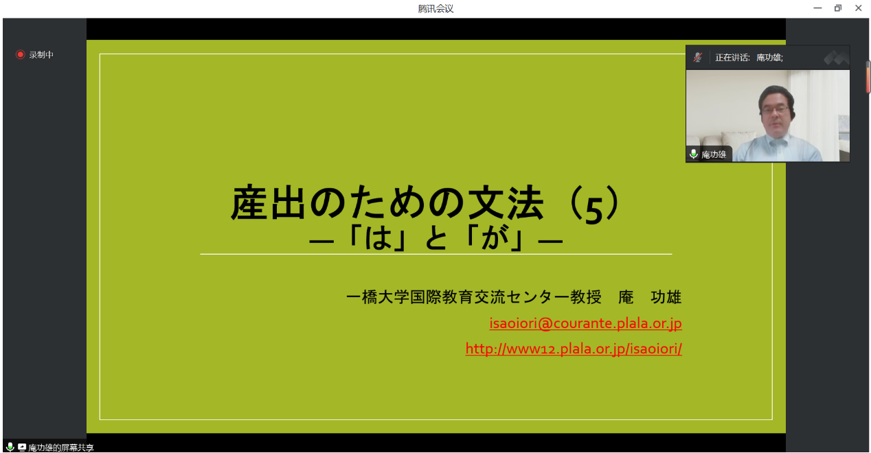2023年10月15日上午9点,威尼斯官网通过腾讯会议平台成功举办了以“日本語教育文法の実際:「は」と「が」”为主题的第181场明德讲堂系列讲座,即一带一路背景下西部日语教师教育系列的第9场讲座。本次讲座由日本一桥大学国际教育交流中心庵功雄教授主讲,威尼斯官网史曼副教授主持,20多名校内外师生参加了此次讲座。